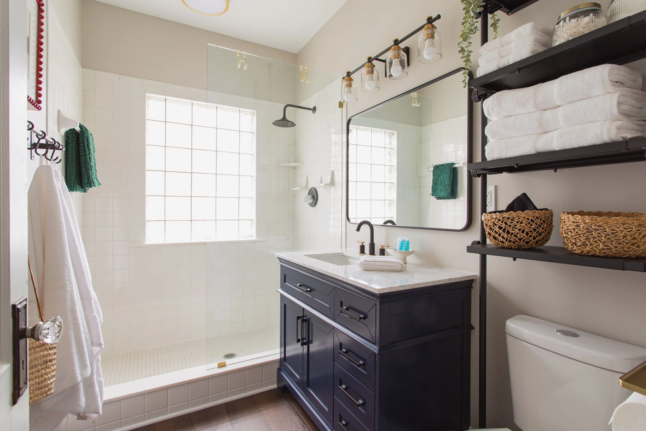 Bathroom: A fresh, well-appointed full bath featuring walk-in shower, spacious vanity, fluffy towel stack, plenty of hooks, & essentials like shampoo, conditioner, soap, & a hairdryer.