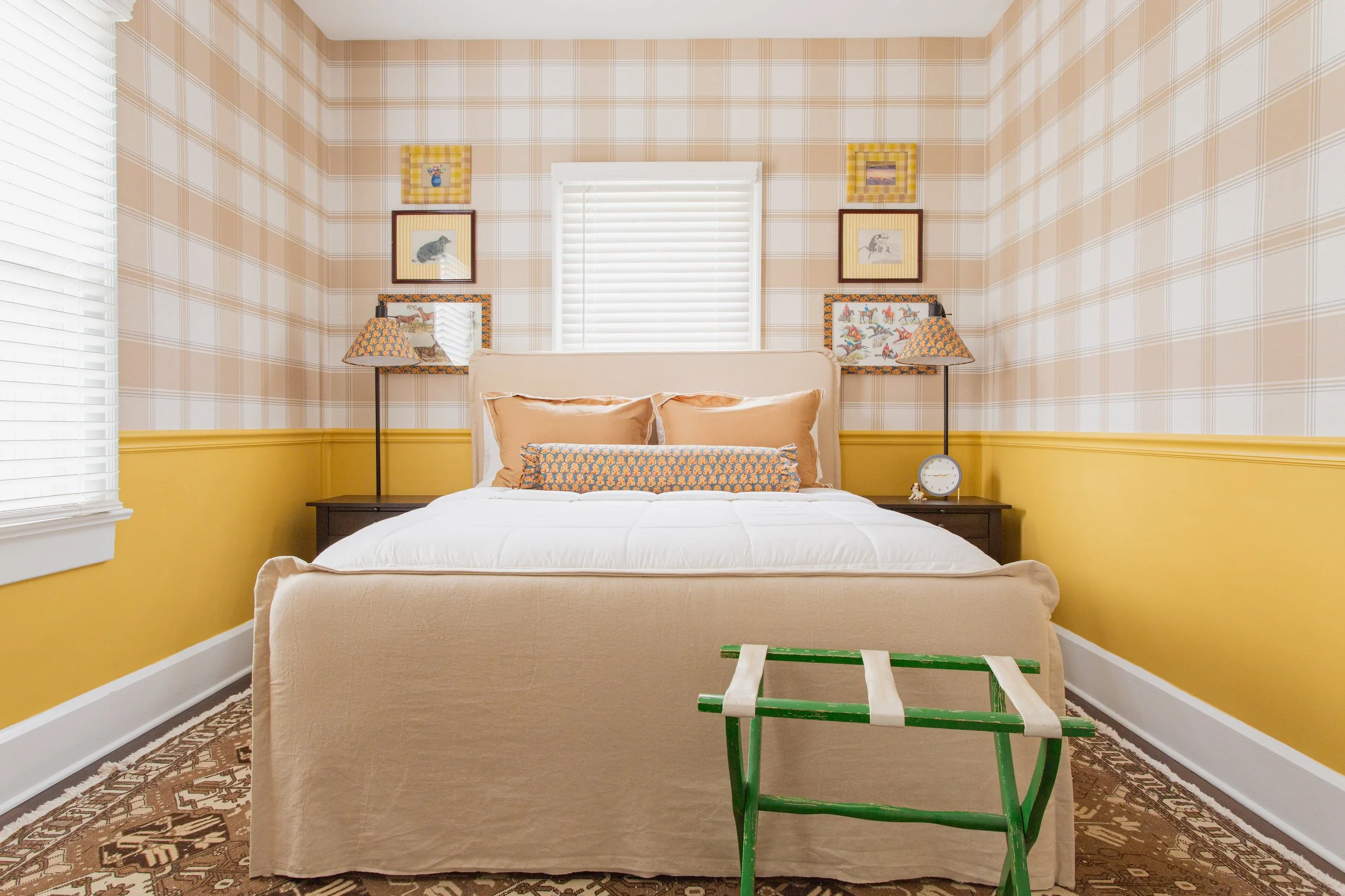 Bedroom 1: A bright, cozy retreat featuring a bespoke, plush slipcovered queen bed with butter-soft linens, roomy closet with a floor-length mirror, large vintage mid-century modern desk with a stool, and cheerful, one-of-a-kind décor.